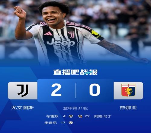 体育播报4月7日宣 北京时间0:00,意甲第31轮尤文图斯vs热那亚,比赛在都灵安联球场打响!上半场,尤文连续3人头球接力,布雷默破门;麦肯尼反击建功,随后门前1米错失空门良机!下半场,麦肯尼再失良机,戴维中柱;布雷默送点,迪格雷戈里奥神勇扑点!最终,尤文主场2-0击败热那亚,意甲5轮不败,距离前四仅1分。