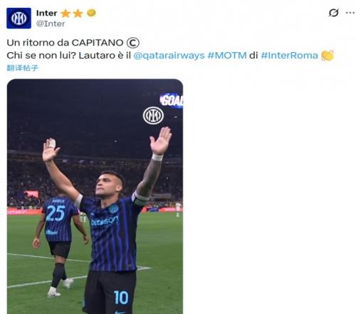 他也在今日被俱乐部官方评选为本场比赛的队内MVP。国米官方也点评道:“队长回归!除了他还能是谁呢?劳塔罗当选国米vs罗马的队内MVP。”